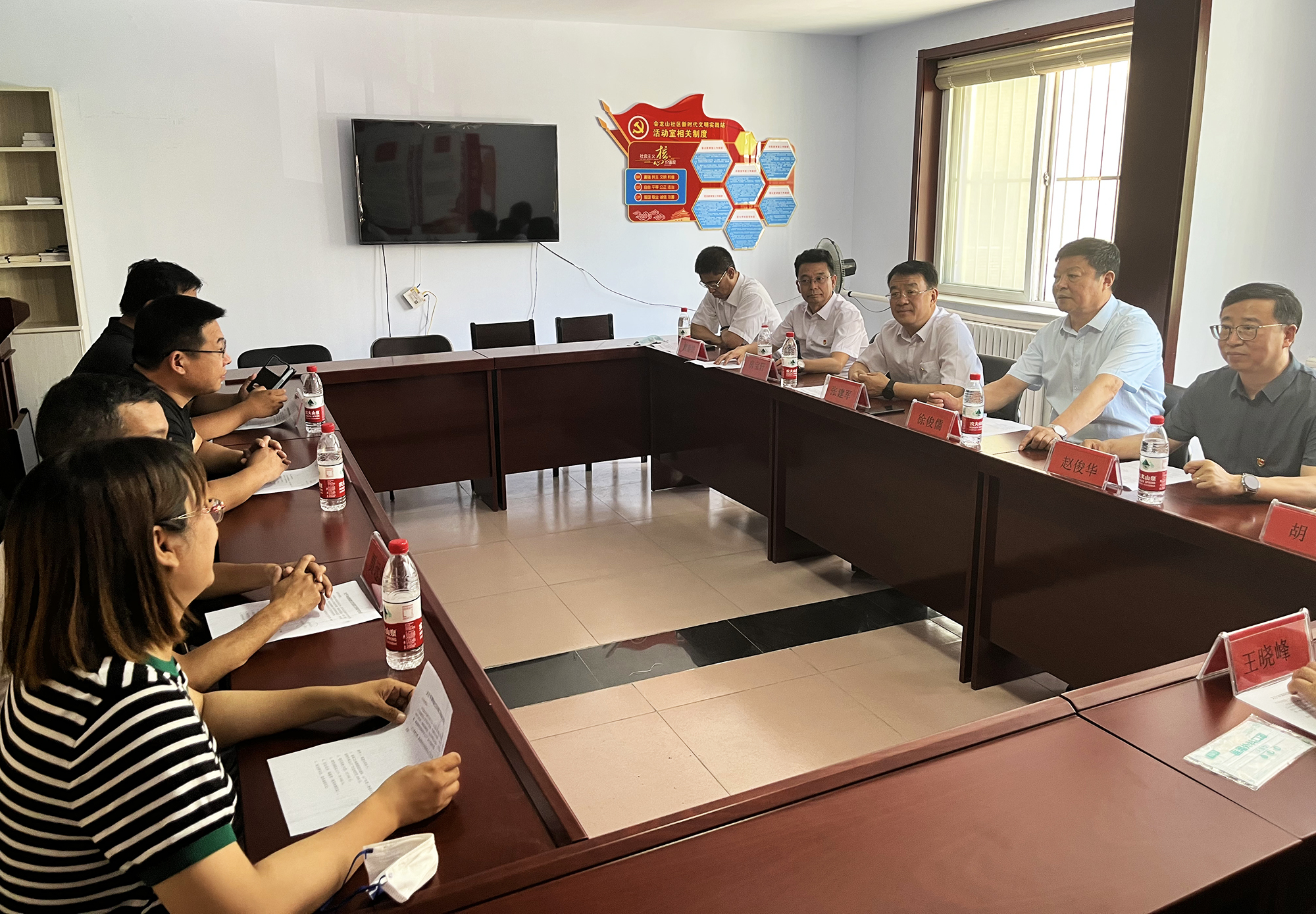 捐贈儀式后,國控集團領(lǐng)導(dǎo)班子與橋東街道、會龍山社區(qū)主要負責人,就結(jié)對幫建工作進行座談,詳細了解了創(chuàng)城工作開展情況、存在問題及下一步打算,針對社區(qū)基礎(chǔ)設(shè)施不完善、公共停車泊位施劃不合理、樓道雜亂和小廣告亂貼等問題,研究制定了具體舉措。會上,為感謝國控集團在抗擊疫情和結(jié)對幫建工作中的大力支持,橋東街道、會龍山社區(qū)向集團公司贈送了“下沉一線保民平安、抗擊疫情沖鋒在前”錦旗。